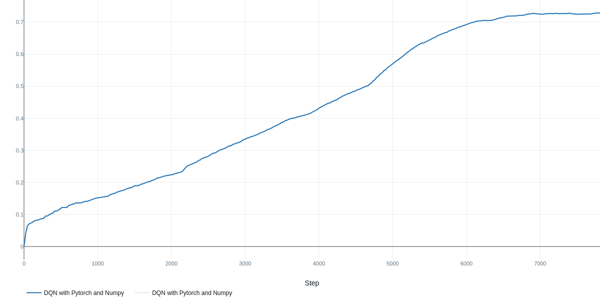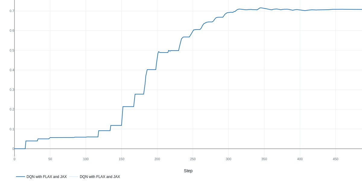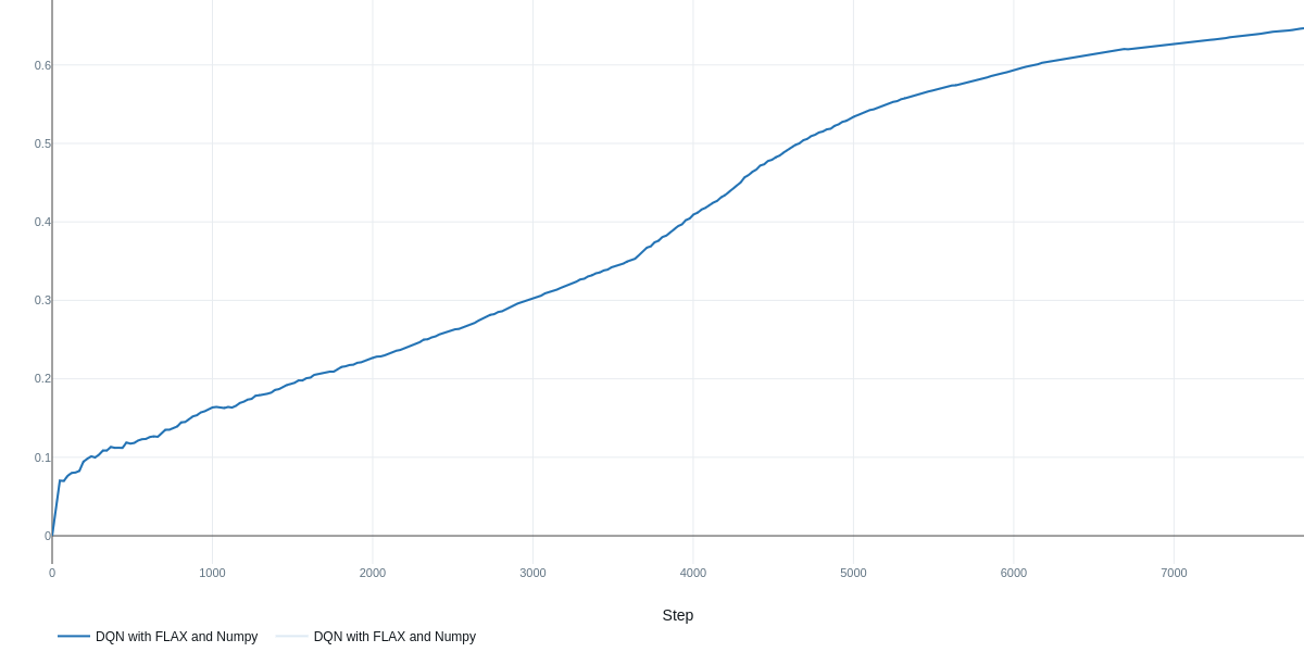We note from the results in Table 2, that hyperparameters optimization was helpful in finding a good model that reached good performance (0.73 with 40 trails) with Pytorch. The other programs with JAX and FLAX got close but still a bit worse which can be attributed to random initialization of the different packages. Doing more search trails can possibly lead to better results for all methods. Note also that increasing the buffer size in DQN (or any off-policy method) is important to take full advantage of the rollout speed up, otherwise performance can drop even with very fast environment.