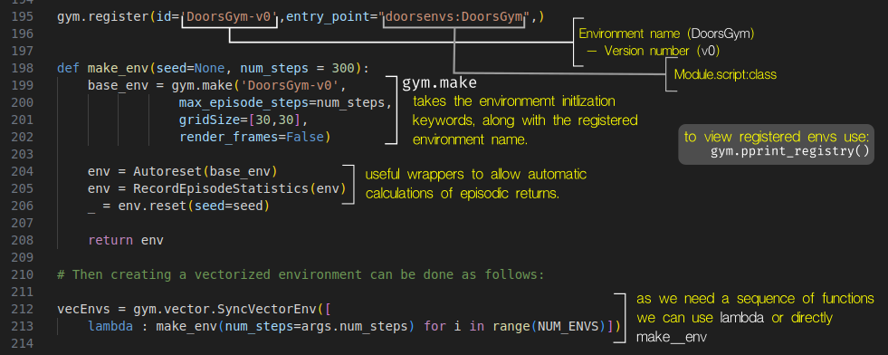 - The following code snippet shows an example of our Doors environment converted to stateless class, while still compilable with gymnasium. Specific new functions are explained in comments.