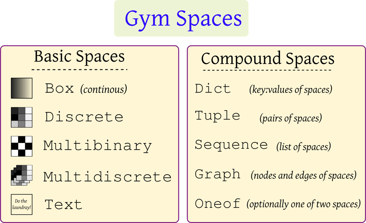 Spaces objects: used to define the state and action values and distributions. Namely, these spaces represent sets of specific constrains. Example of all the possible sets are shown in Figure 2 imported from