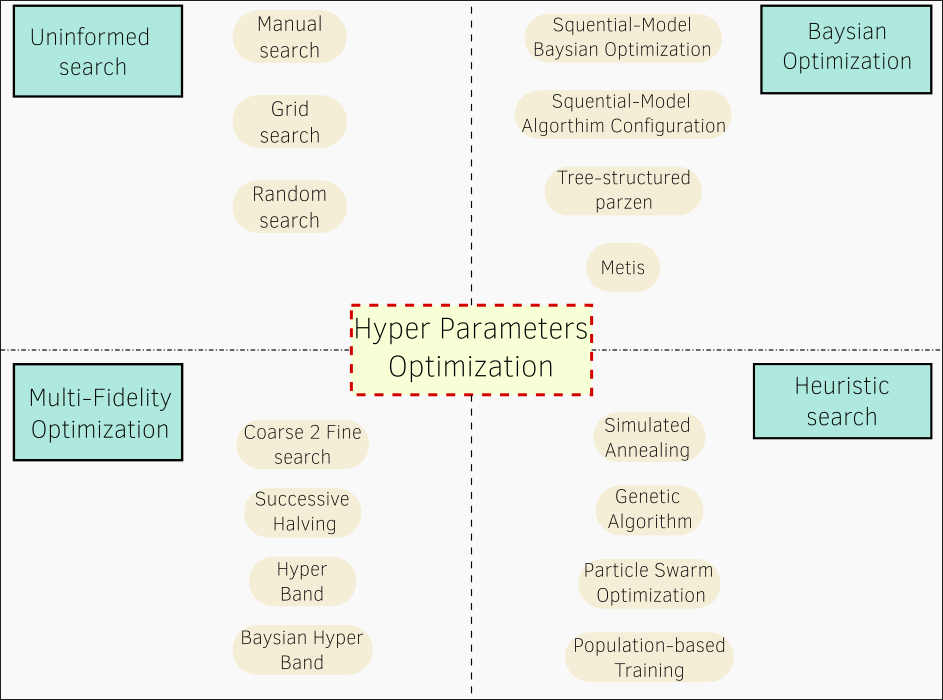 Generally speaking, there's four main branches of hyperparameters optimization methodologies, varying in their complexity and approach, as the following figure shows.