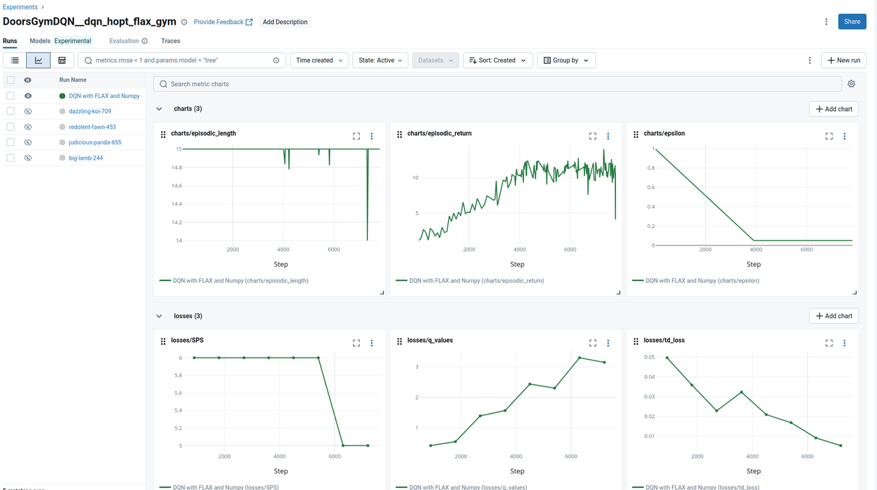 As the action space for this environment is discrete, we chose to use Deep Q-Network (DQN) training algorithm [3] based on CleanRL [4] implementation to learn the policy. In the following we will show how to track the training metrics and plot them against training time in Mlflow.