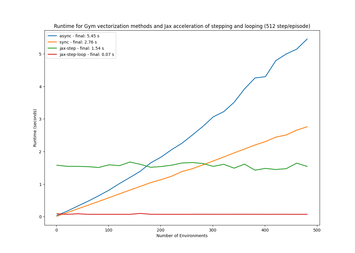 Figure 11: Comparing runtime of different vectorization methods. JAX seems insensitive to number of environments running up to 500. Speeding up the for loop led to super fast performance of 0.07s.