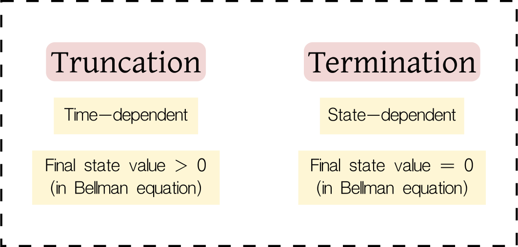 Figure 3: difference between terminating (goal achieved) and truncating (time limit reached) a simulated episode.