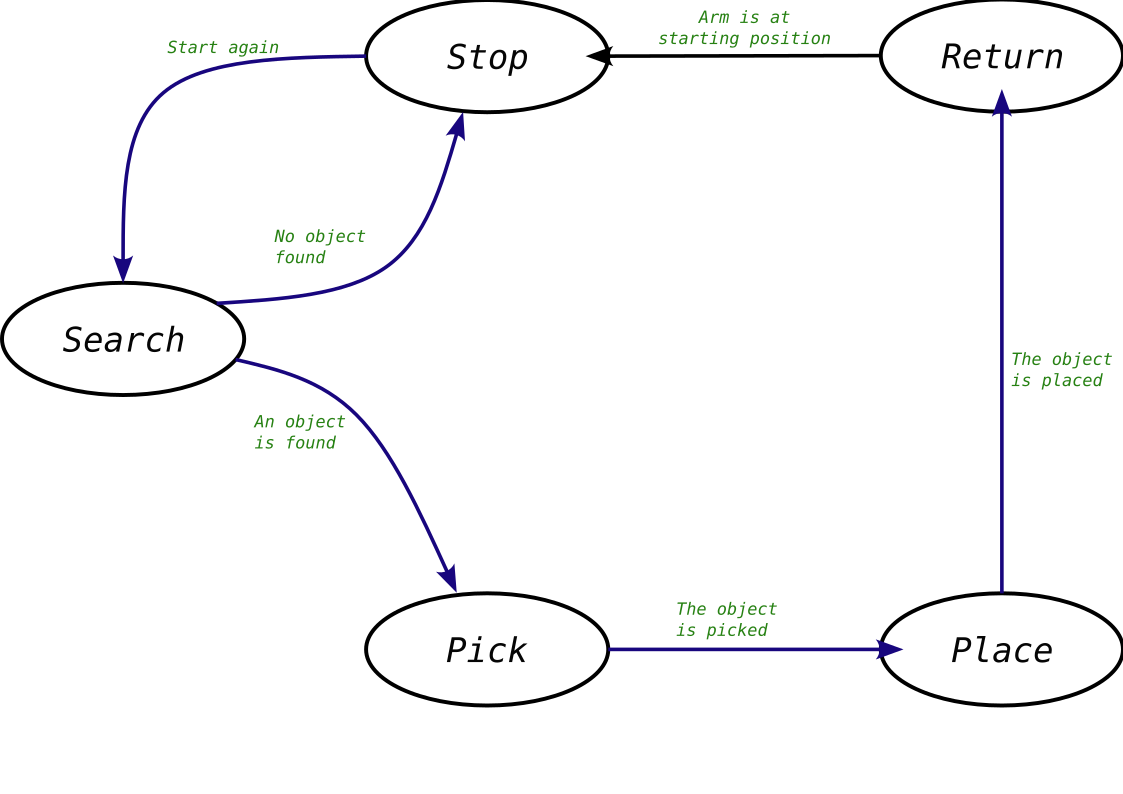 As an example of FSM, let's consider a pick-and-place task done by robotic arm. As a first step you will need to define all the states that the arm could be working in: