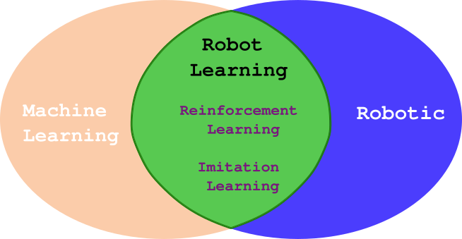 The term robot learning, is usually utilized in the context of applying state-of-the-art machine learning methods to teach a robotic arm generic skills. This field has witnessed new advances due mainly to the availability of considerable amount of recoded datasets of robotic trajectories doing many different tasks as explained here. In that regard, we can consider this field as the intersection between traditional robotics and the newly advances in machine learning as the figure below shows.