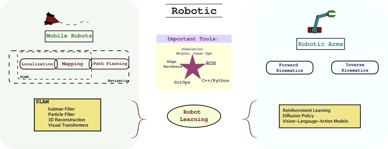 The field or robotic may seem huge and hard to categorize, as there are virtually all kind or robots: ground, flying or underwater, autonomous or controlled, humanoid or four-legged. However, from the perspective of the functional part, we need to solve two main tasks in any robotic project: navigation and manipulation. The first problem requires mapping, localizing and path planning of the robot, while the second involves controlling a robotic arm by solving the forward/inverse kinematic problem either in iterative or machine learning manner.
