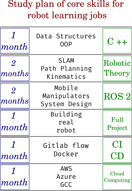 Main skills and their estimated study time ordered seqationally to qualify for robotic/ml engineer roles.
